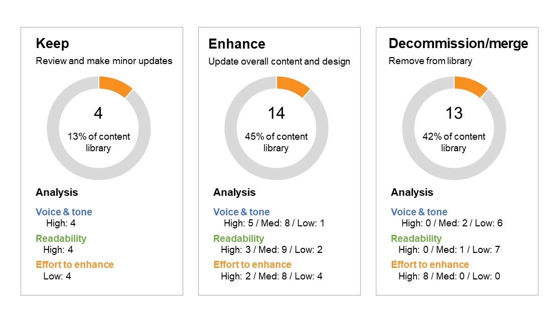 Analysis of the content library revealed that much of the library could be decommissioned due to redundancies and poor content quality.