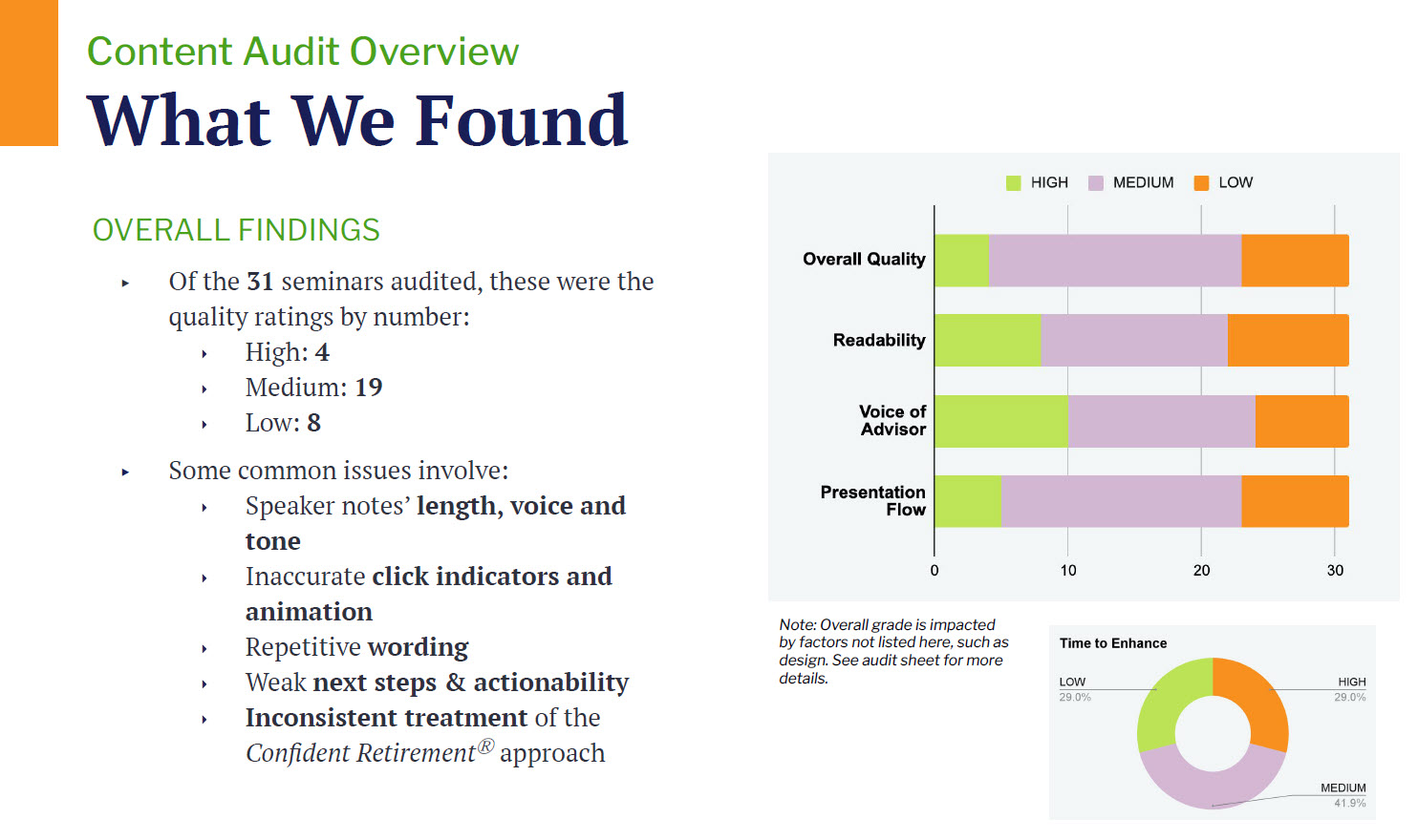 The content audit provided an objective way to identify content gaps and enhancements within the content library.